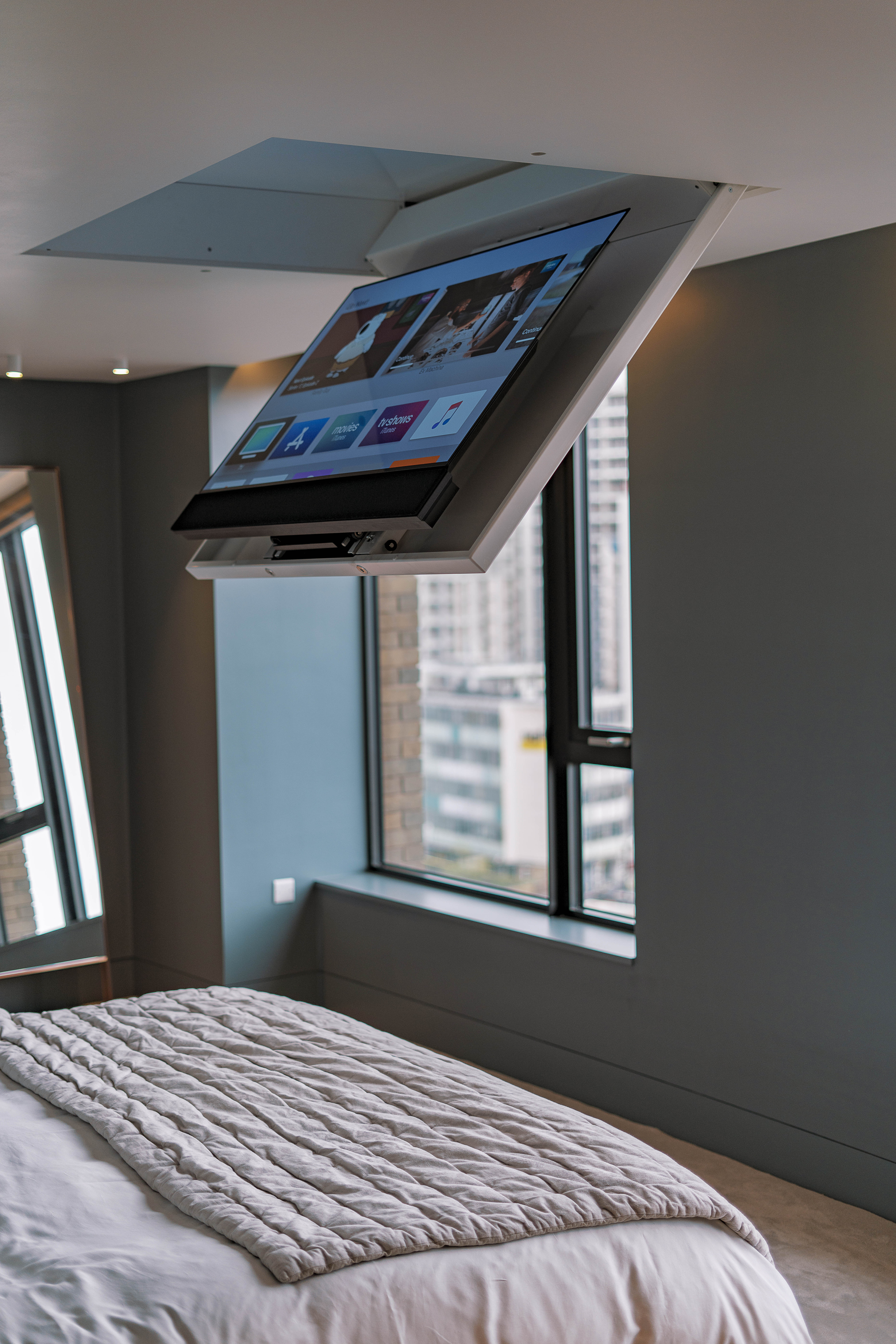 With precise positioning options, you can find the perfect angle for every movie night. Transform your living room or outdoor environment into a private theater with the touch of a button and enjoy the ultimate comfort and convenience.We understand the importance of personalization. Our hidden motorized TV mounts offer various customization options, allowing you to select the ideal mount style, finishes, and control mechanisms that suit your taste and lifestyle. Seamlessly integrate your television into your home automation system for easy control from anywhere in your home.